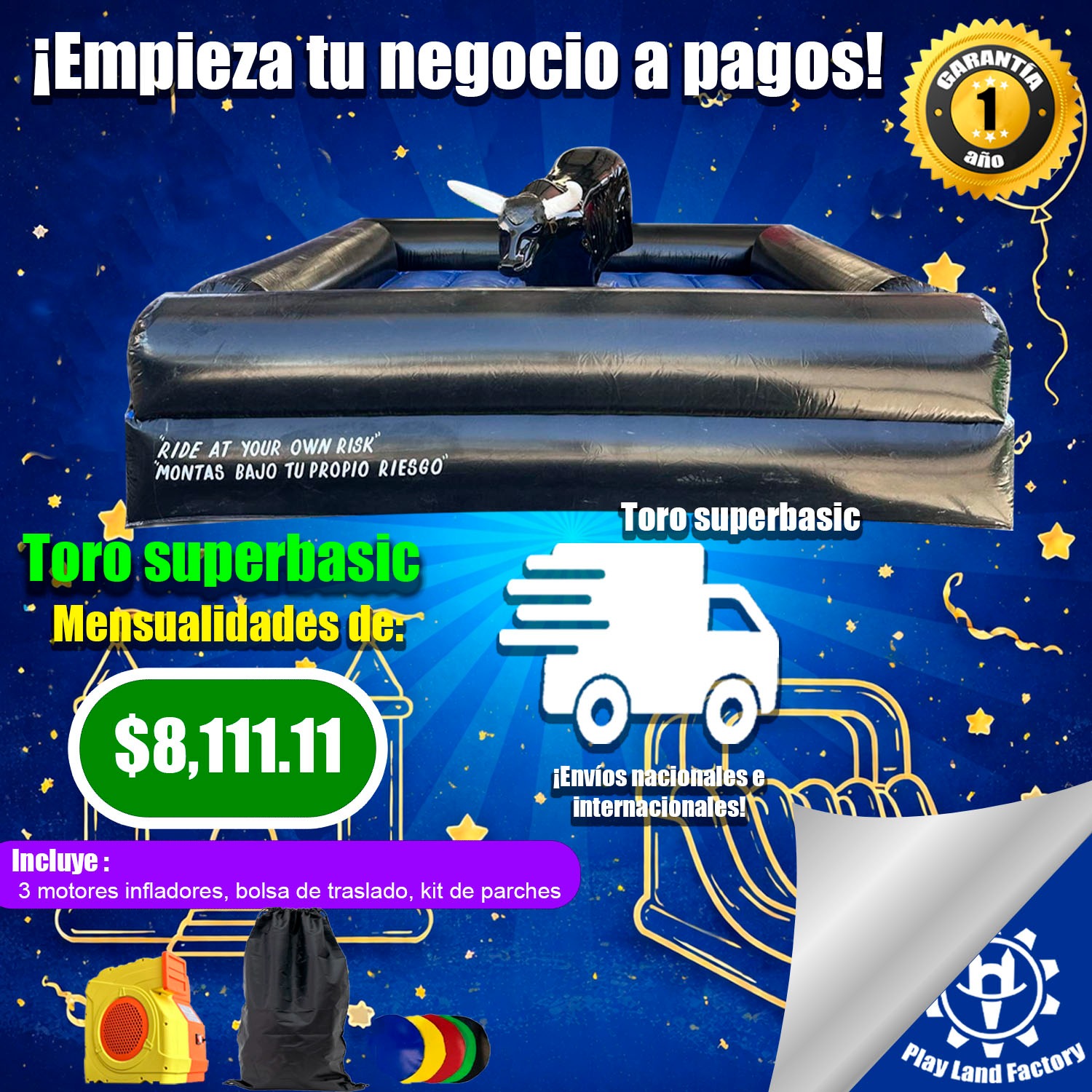 Toro con motor de 1hp y capacidad de hasta 145 kg, figura extra reforzada con 4 capas de fibra de vidrio, refuerzo de petate y 8 figuras diferentes a elegir.